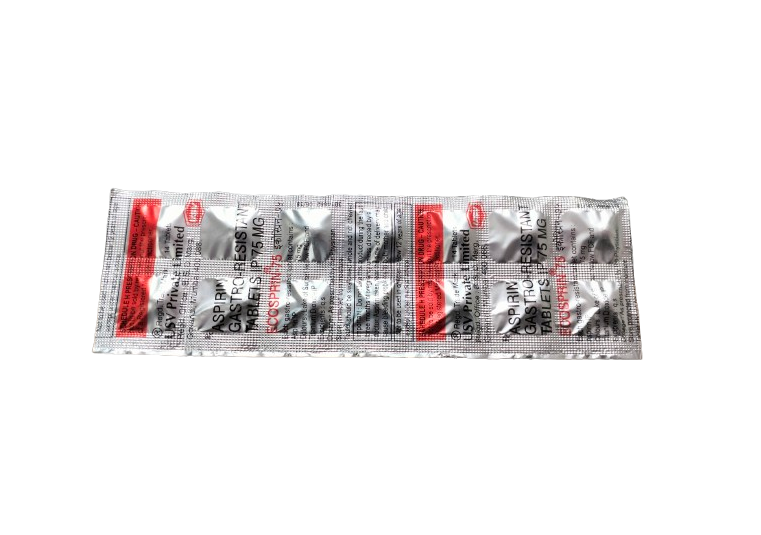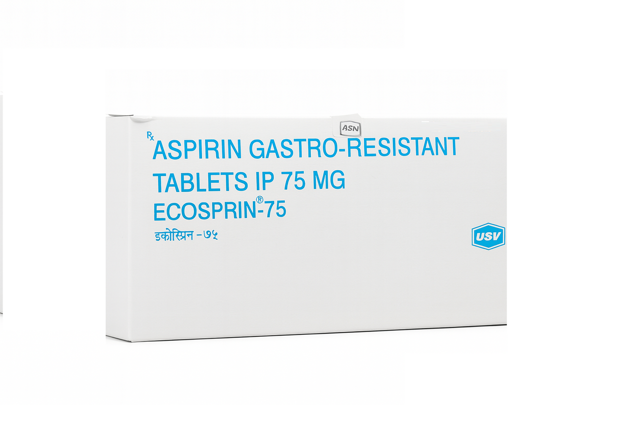 Aspirin Gastro-Resistant Tablets IP 75 mg (Ecosprin-75) is a low-dose prescription antiplatelet medicine used to prevent heart attacks, strokes, and blood clot formation in patients with cardiovascular conditions. Its special gastro-resistant coating protects the stomach lining, minimizing irritation while maintaining the effectiveness of Aspirin.
