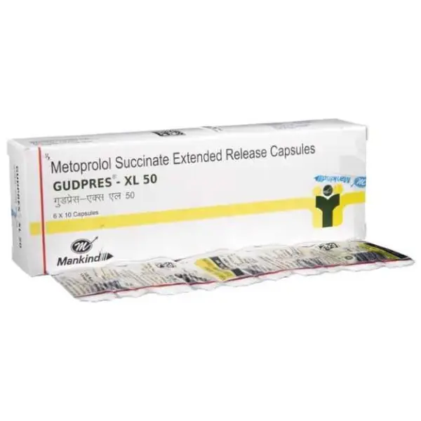 Gudpres-XL 50 contains Metoprolol Succinate 50 mg (Extended Release), a beta-blocker used for the management of high blood pressure (hypertension), chest pain (angina), and heart rhythm irregularities. It works by slowing the heart rate and relaxing blood vessels, improving oxygen supply and reducing strain on the heart.