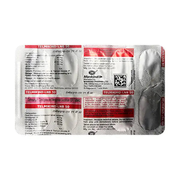 Telmikind-LNB 50 Tablets by Mankind Pharma Ltd. contain a scientifically balanced combination of Telmisartan (40 mg), Cilnidipine (10 mg), and Metoprolol Succinate ER (50 mg).