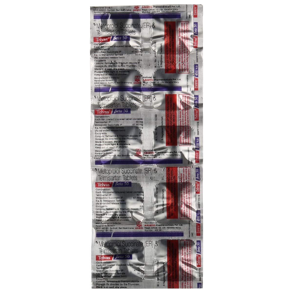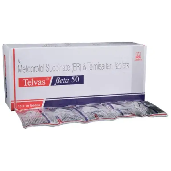 Telvas® Beta 50 — Combination tablet containing Telmisartan 40 mg and extended-release Metoprolol Succinate 50 mg. Supplied as 10 x 10 tablets per box. Each film-coated bilayered tablet contains: Used for the treatment of hypertension (high blood pressure) where combination therapy is indicated. May help reduce risk of cardiovascular events as advised by your physician. Important: Use exactly as directed by your prescribing physician. Store in a cool, dry place. Protect from light and moisture. Keep out of reach of children. Manufactured / Marketed by Aristo Pharmaceuticals (or as printed on the pack). Available as 10 x 10 tablets per box (verify pack size before sale). Schedule H / Prescription Drug: To be sold only on the prescription of a Registered Medical Practitioner. Do not sell or supply without a valid prescription. Ensure compliance with local laws and Shopify policies before listing prescription medicines. For informational purposes only — not medical advice. For any medical questions, consult a licensed physician or pharmacist. Highlights