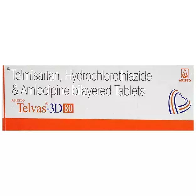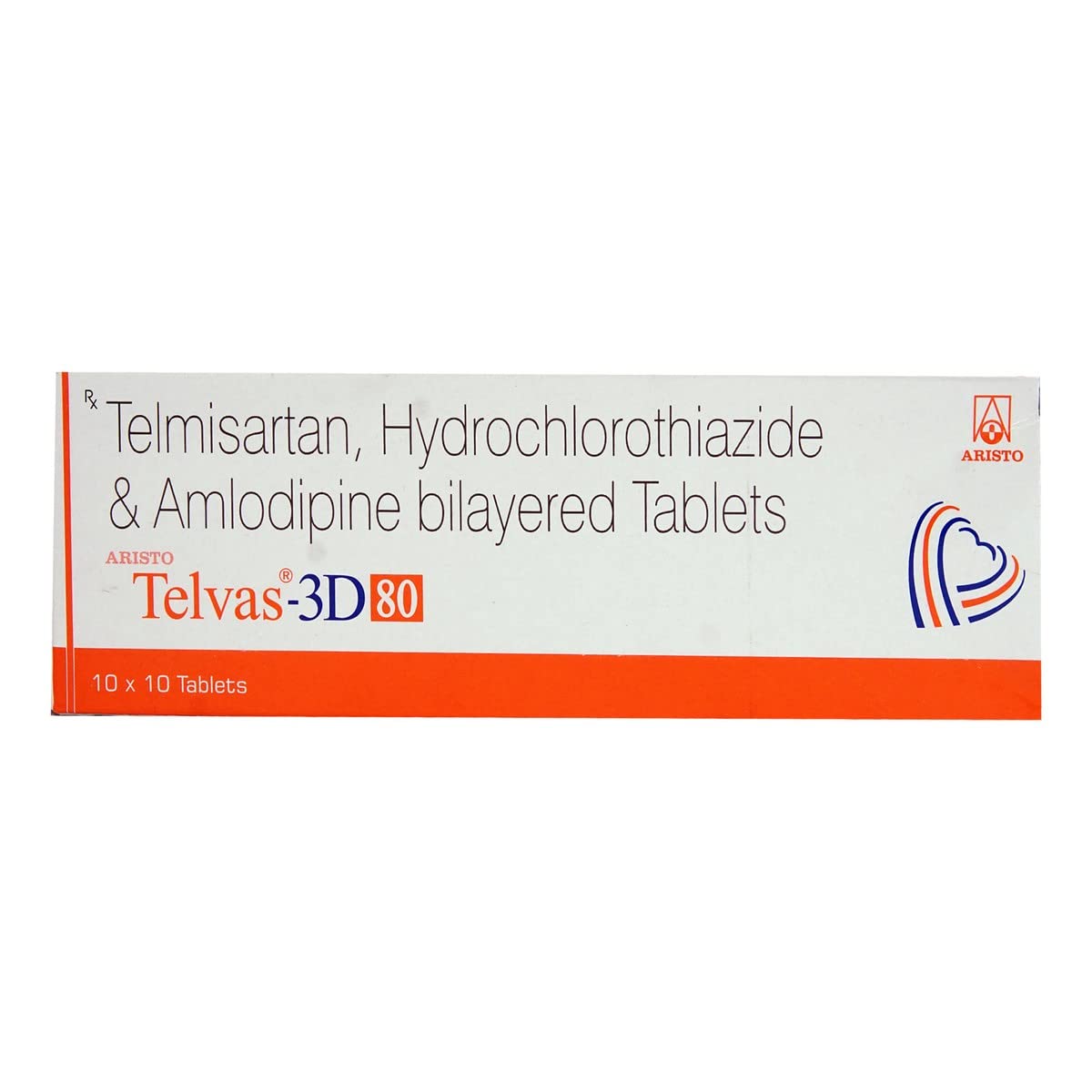 Telvas-3D 80 Tablet contains Telmisartan 80 mg, Hydrochlorothiazide 12.5 mg and Amlodipine 5 mg. It helps control high blood pressure and reduces cardiovascular risk.