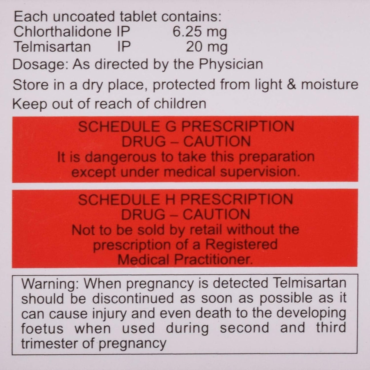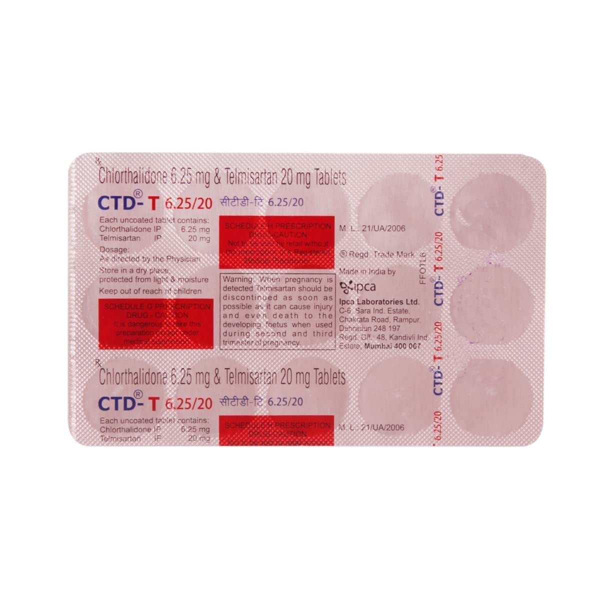 CTD-T 6.25/20 Tablet is a combination of Telmisartan and Chlorthalidone. Telmisartan relaxes and widens blood vessels for smoother blood flow, lowering blood pressure. Chlorthalidone is a diuretic (water pill) that increases urine output and removes excess fluid, helping reduce BP further.