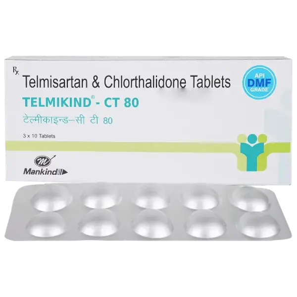Telmikind-CT 80 Tablets from Mankind Pharma Ltd. combine two effective antihypertensive agents — Telmisartan (80 mg) and Chlorthalidone (12.5 mg) — for powerful and sustained blood pressure control.