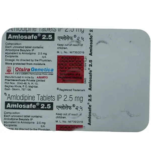 Amlosafe 2.5 contains Amlodipine, a calcium channel blocker that helps relax blood vessels. It is generally prescribed by doctors for the management of high blood pressure and certain heart-related conditions. By relaxing and widening the blood vessels, it assists in improving blood flow and helps keep blood pressure under control as advised by your physician.