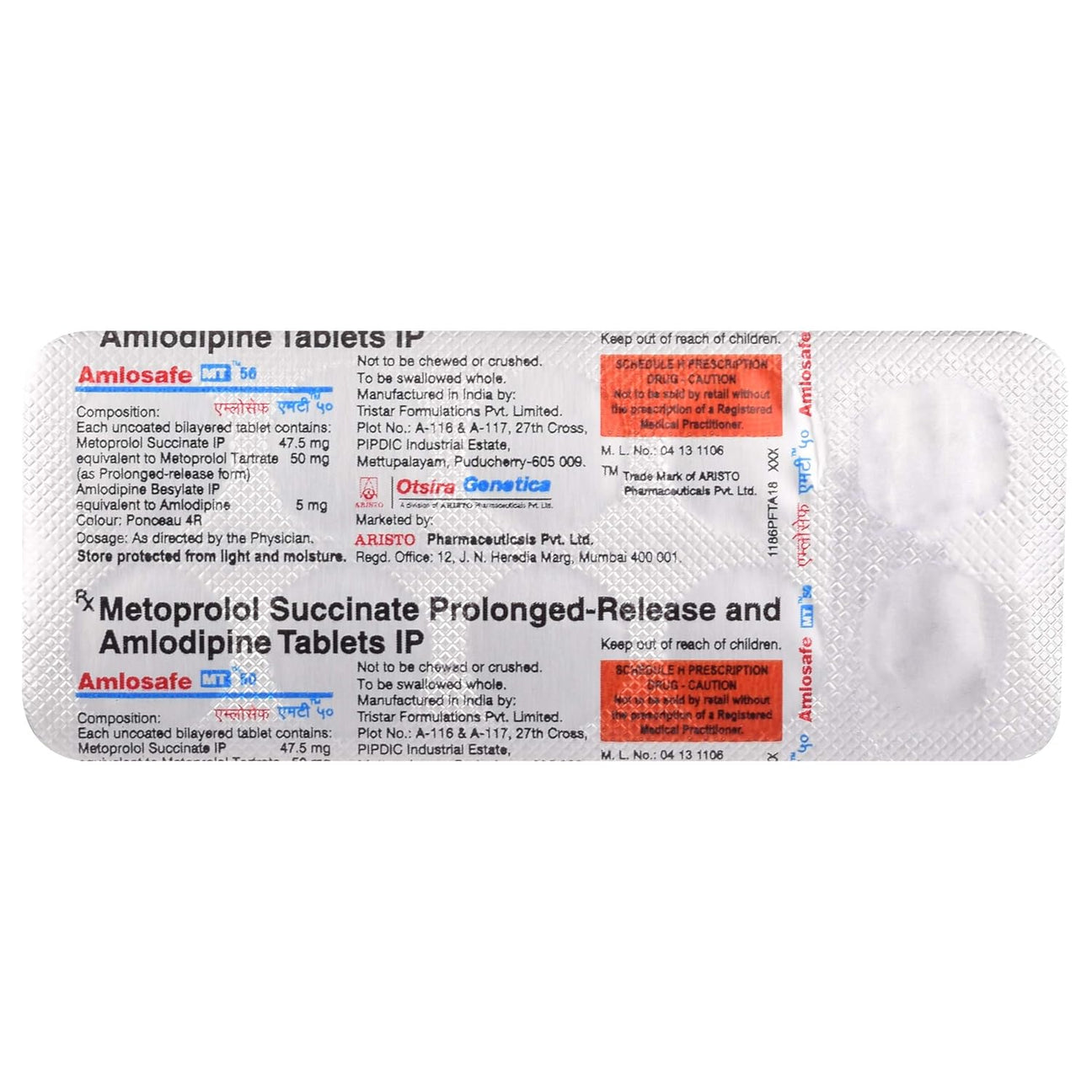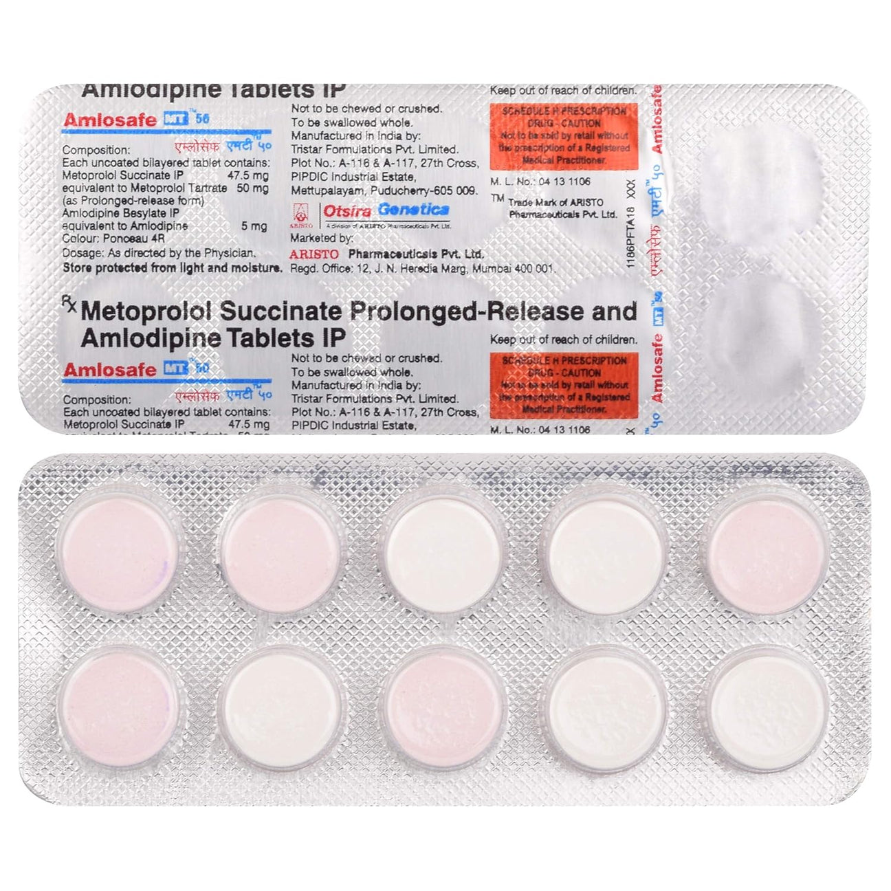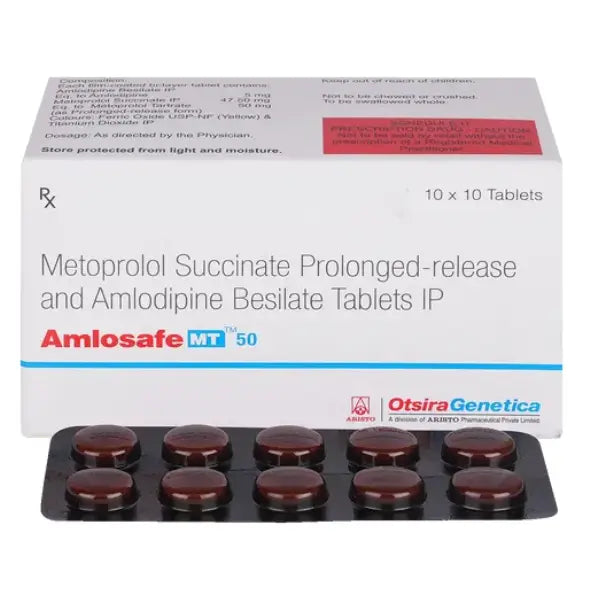 Amlosafe MT 50 Tablet is a prescription medicine that combines Metoprolol Succinate (a beta-blocker) and Amlodipine (a calcium channel blocker). It is used on a doctor’s prescription to help manage high blood pressure and certain heart-related chest pain (angina).