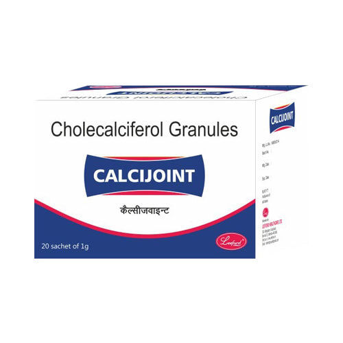 Calcijoint Sachet contains Cholecalciferol (Vitamin D3), which helps maintain healthy bones and teeth by improving calcium absorption from the intestines. It is used as a nutritional supplement especially for individuals with Vitamin D deficiency. Each sachet contains 60,000 IU of cholecalciferol in granule form, supporting bone strength, immunity, and proper body development.
