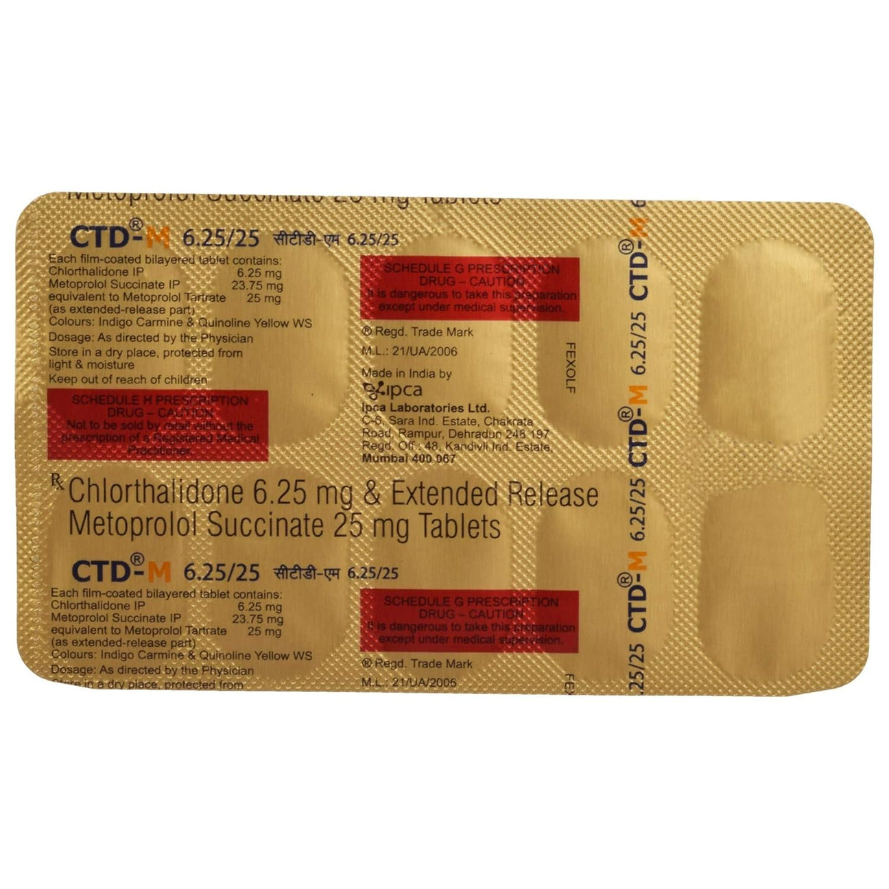 CTD-M 6.25/25 Tablet ER is used to treat hypertension (high blood pressure). It is prescribed when a single medicine is not enough to control blood pressure. This tablet also reduces the risk of future heart attacks and strokes. It may be taken with or without food, preferably in the morning to avoid nighttime urination. Continue taking the medicine even if you feel well, as uncontrolled blood pressure can be dangerous.