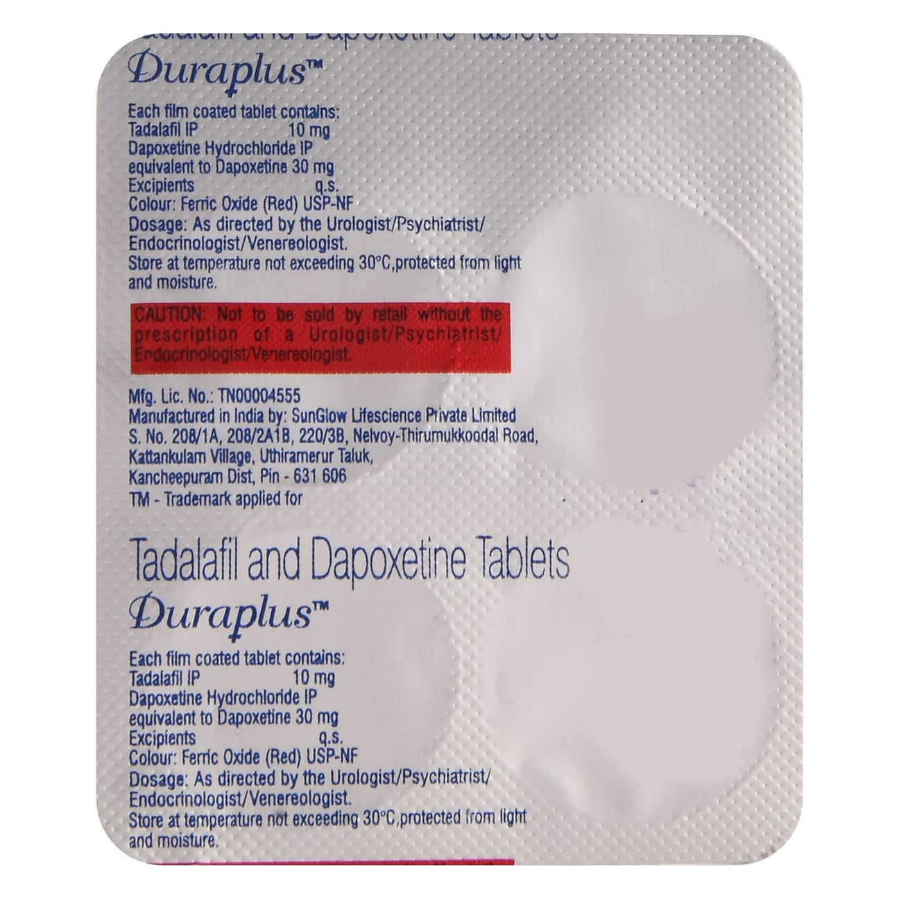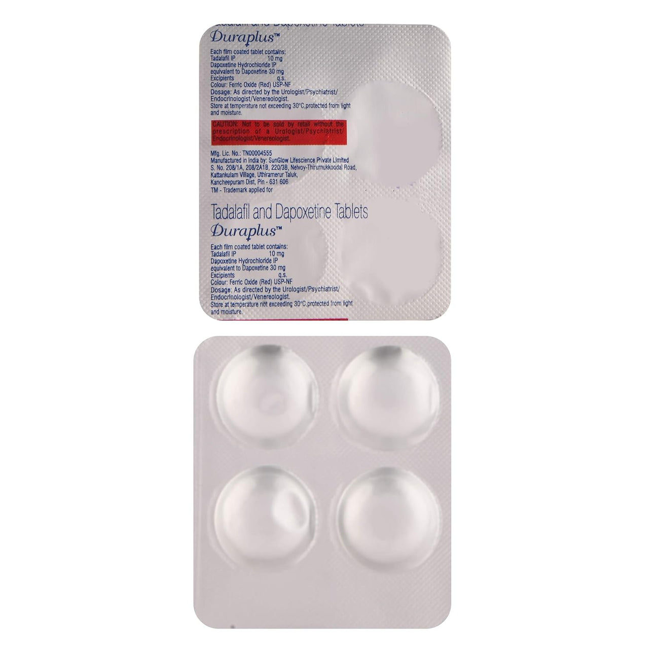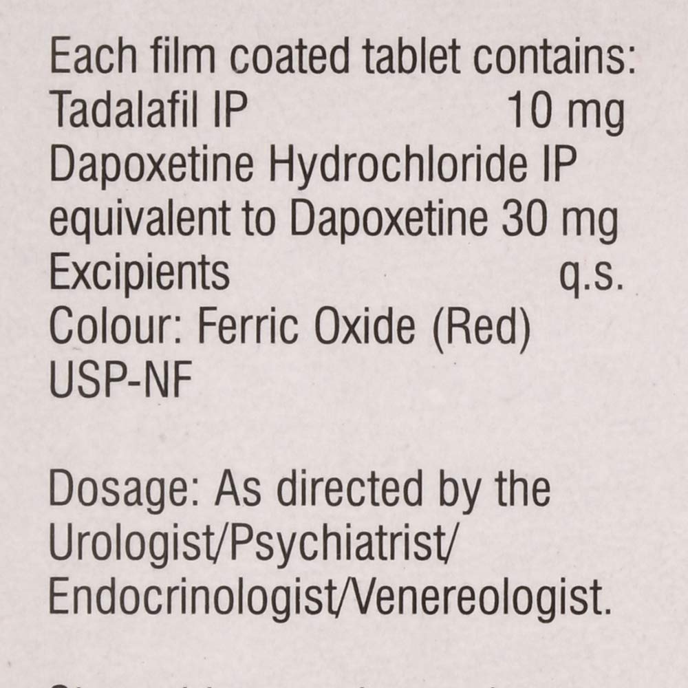 Duraplus Tablets mein Tadalafil IP 10 mg aur Dapoxetine Hydrochloride IP (equivalent to Dapoxetine 30 mg) hota hai. Ye combination medicine doctor ke prescription par male sexual health ke kuch specific problems ke treatment ke liye use ki jati hai. Hamesha apne urologist / psychiatrist / endocrinologist / venereologist ki salah ke anusaar hi istamal karein.