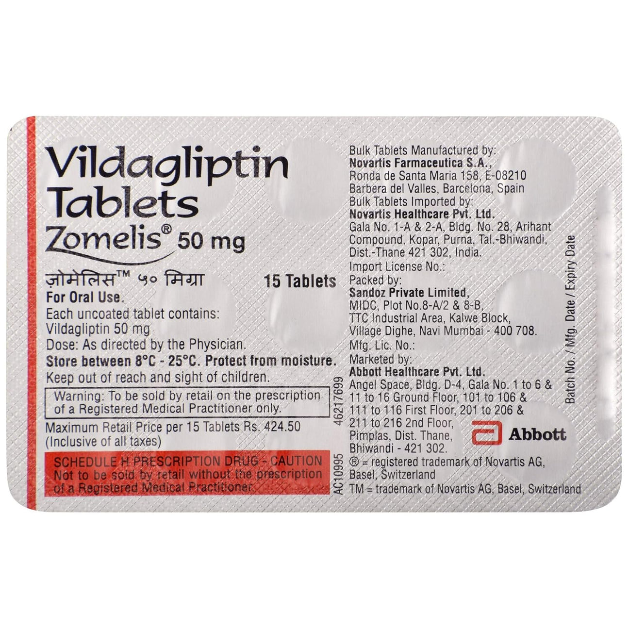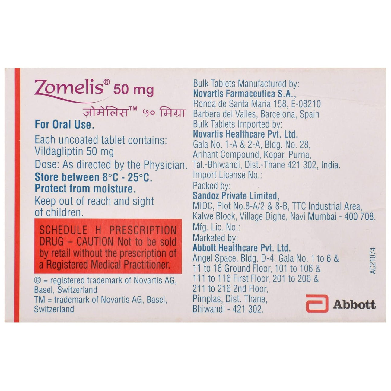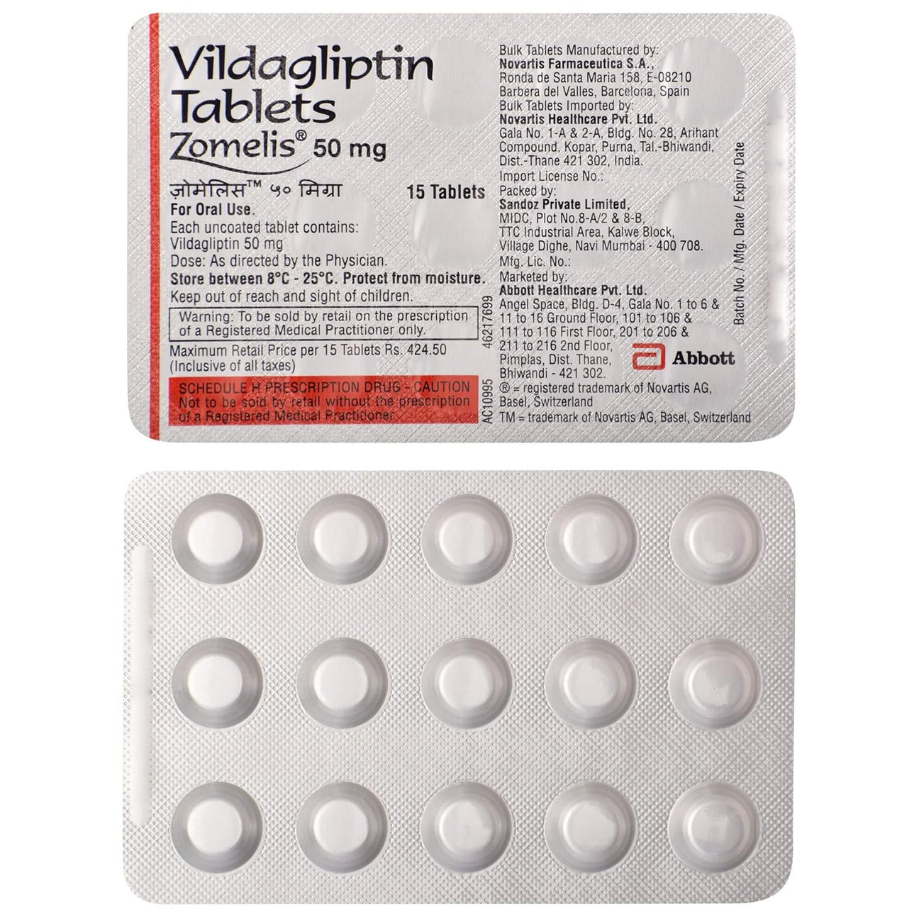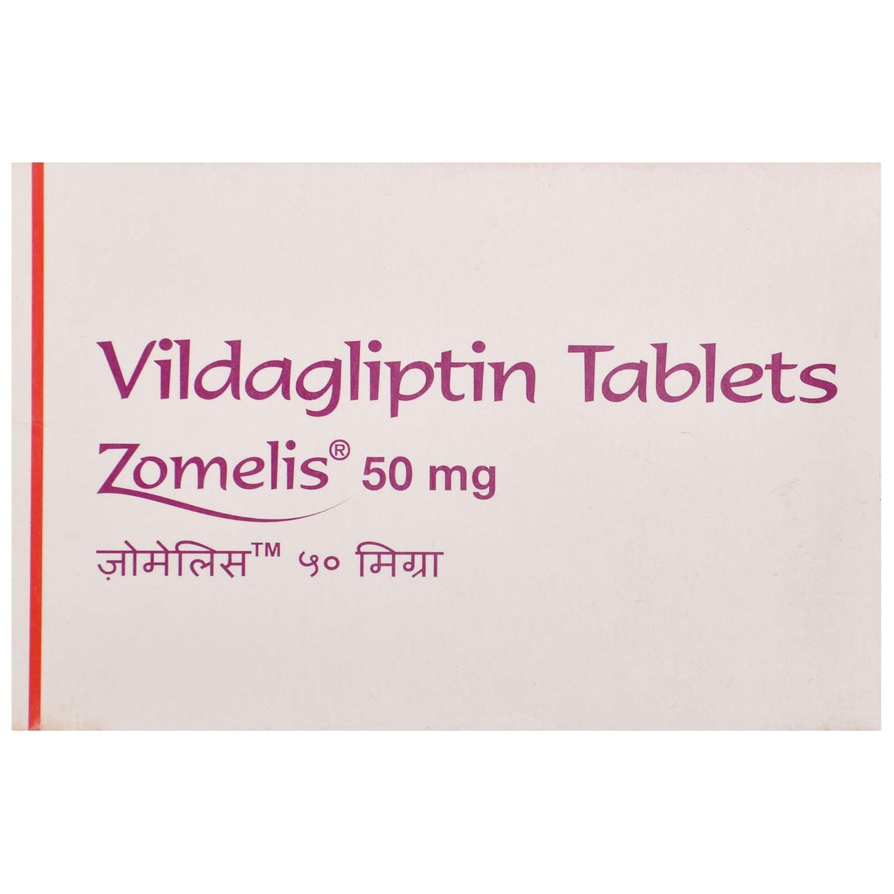 Zomelis 50mg Tablet is an antidiabetic medicine used to treat type 2 diabetes mellitus. It helps control blood sugar levels along with diet and exercise. This reduces the risk of diabetes-related complications such as kidney damage, blindness, nerve damage, and heart problems. It may be used alone or with other diabetes medications. Take it at the same time every day as prescribed by your doctor.